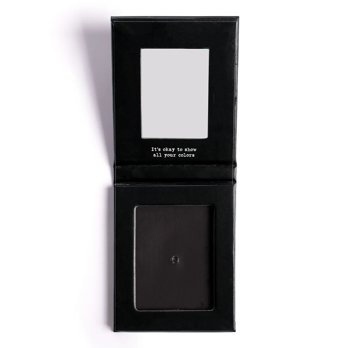Magnetic cardboard compact for one face powder pan with built-in mirror.
